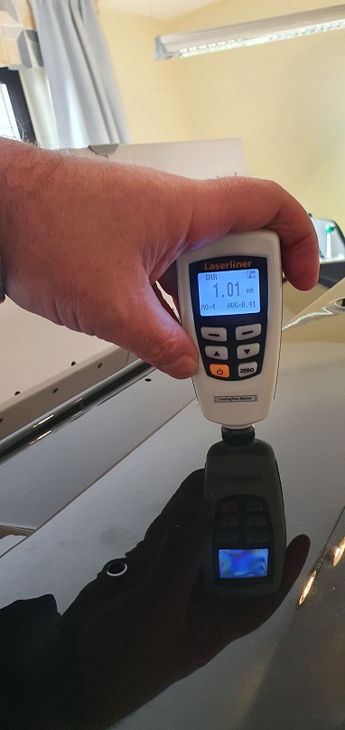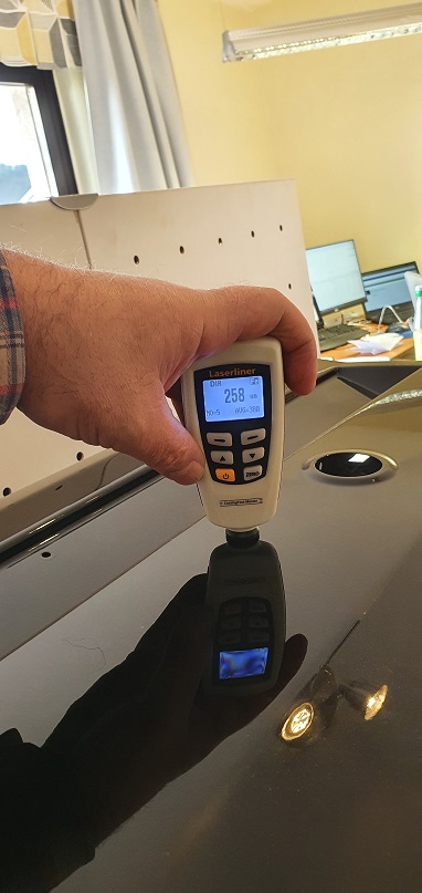 An einer Heckklappe wurden ebenfalls mehrere "Behandlungen" durchgeführt. Wie oben beschrieben wurde diese Heckklappe thermografiert und als Bestätigung mittels eines Schichtdickenmessgerätes die verschiedenen Lackschichten gemessen.