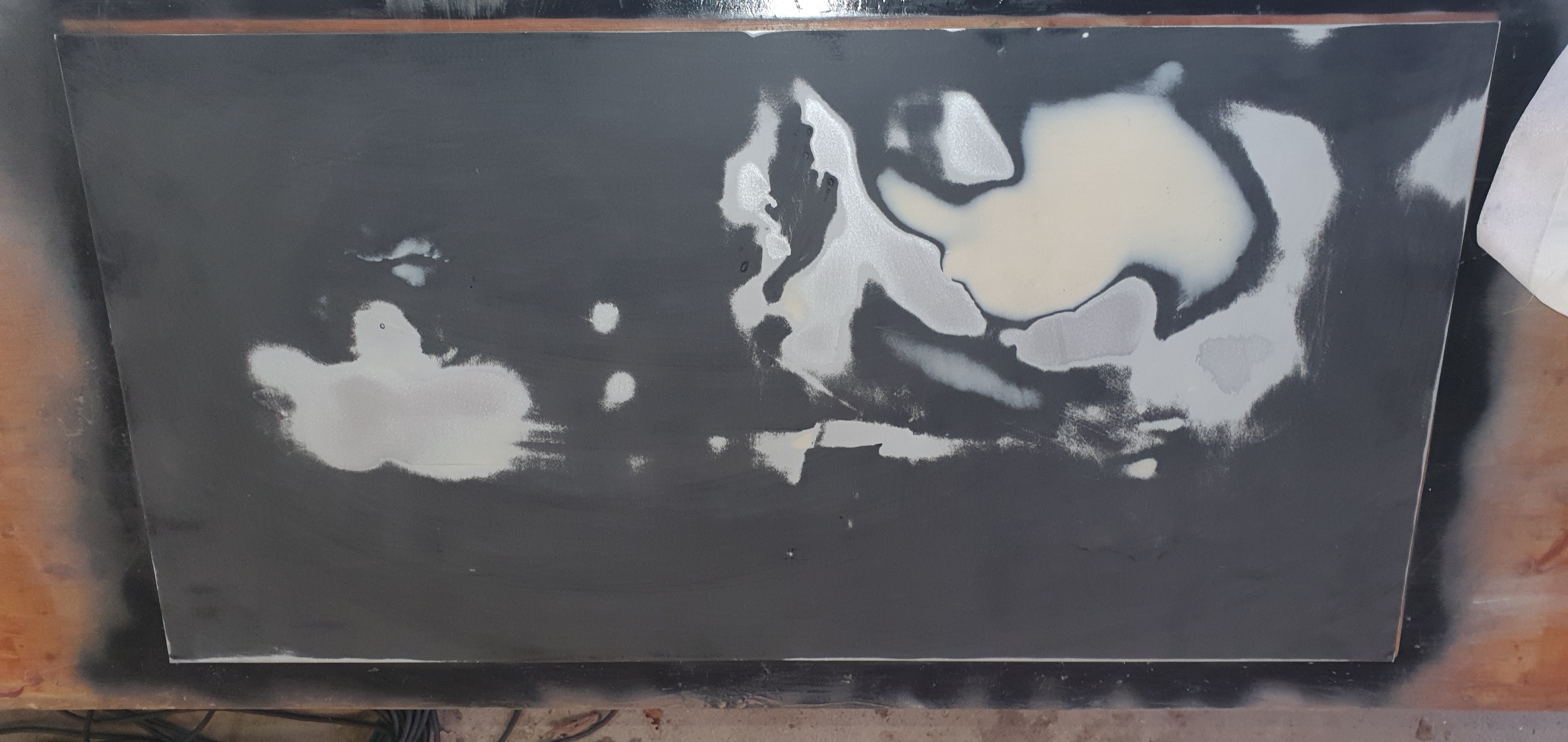 Das Blech links wurde nach der „Behandlung“ wieder lackiert, so dass ein Schaden von außen nicht zu erkennen war. In der Thermographie (rechts) ist der Spachtel und auch die Flächen mit weniger Material sehr gut zu erkennen.