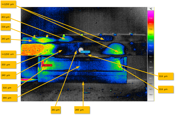 Bei der Puls-Phasen-Thermografie wird durch einem kurzen Licht - Impulspuls ein Wärmefluss generiert. Unmittelbar danach generiert die Thermografiekamera bis zu 30 IR-Bilder / sek. Ein defekt unterhalb der Oberfläche führt dann zu einer veränderten Oberflächentemperatur.
